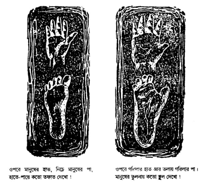 ওই আধা-মানুষ থেকে আমরা যে মানুষ হয়েছি তা আসলে আমাদের এই হাতের গুণেই। আর কোনো জানোয়ারের এ-রকম হাত নেই যে-রকম আছে আমাদের। শিম্পাঞ্জীর থাবা বা গরিলার থাবা কিন্তু হাত নয়। তাই দিয়ে বড়জোর একটা কিছুকে আঁকড়ে ধরা যায়। কিন্তু তাই দিয়ে হাতিয়ার বানানো যায় না। একমাত্র মানুষই হাত দিয়ে হাতিয়ার বানাতে পারে। আর কেউ তা পারে না। হাতের গুণেই হাতিয়ার। আবার হাতিয়ারের গুণেই হাত। আর এই হাত আর হাতিয়ারের গুণেই মানুষ হয়েছে মানুষ। পশু নয়। আর।