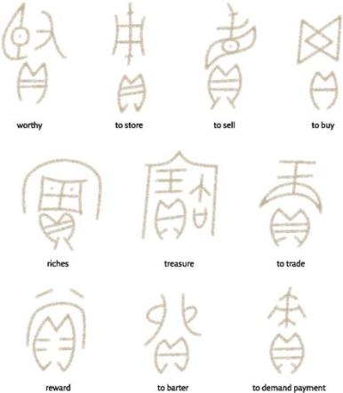 ২৬। প্রাচীন চৈনিক লিপিতে কড়ির উপর নানা ধরনের চিহ্ন দিয়ে টাকা বুঝানো হত। “বিক্রি” কিংবা “পুরস্কার” এর জন্যে আলাদা আলাদা চিহ্ন ছিল।