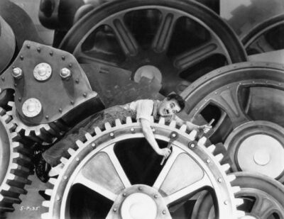 ৪২। মডার্ন টাইমস (১৯৩৬) চলচ্চিত্রে একজন সাধারণ কারখানা শ্রমিকের বেশে চার্লি চ্যাপলিন ।