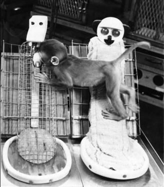 ৪১। হারলোর পরীক্ষার একটি বাচ্চা বানর যেটি ধাতব মায়ের থেকে দুধ খাবার সময়ও কাপড়ে তৈরি মাকে আঁকড়ে ধরে আছে।