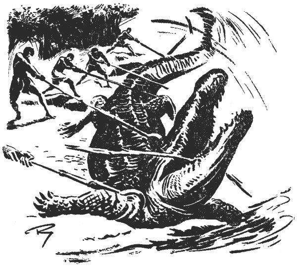 কুমির মারার ব্যবস্থাও নানারকম ছিল। একরকম বঁড়শি-কল ছিল যাতে ছ-টা কি আটটা বড়ো বড়ো ফলা দেওয়া বঁড়শি ইস্পাতের স্প্রিঙের উপর আঁটা থাকত। সেই স্প্রিংগুলো চেপে বঁড়শিগুলো একসঙ্গে করে তাঁত দিয়ে বাঁধলে সেটা পদ্মের কুঁড়ির মতো দেখতে হত। সেই বঁড়শির ভিতরে ও উপরে মাংসের তাল তাঁত দিয়ে বেঁধে, তার গোড়ার দিকের লোহার বোঁটায় ইস্পাতের সরু তার অনেকটা লম্বা করে বেঁধে তারপর দড়ি দিয়ে ডাঙায় মজবুত খোঁটা বা গাছের গুঁড়ির সঙ্গে তা শক্ত করে আটকে কুমিরের বাসার কাছে ফেলা থাকত। কুমির গিলে খায়— টুকরোও করে না, চিবিয়েও খায় না। সুতরাং এই টোপসুদ্ধ বঁড়শি গিলে আটকা পড়ত। এদিকে কুমিরের পেটে গিয়ে সেই বঁড়শির তাঁত গলে ছিঁড়ে যাবামাত্রই স্প্রিং খুলে সেই লোহার পদ্ম খোলা ছাতার মতো ছড়িয়ে কুমিরের পেটের ভিতর গেঁথে যেত। তারপর কুমিরকে টেনে ডাঙায় তুলে শেষ করতে আর কতক্ষণ?