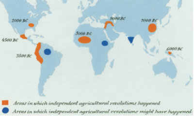 কৃষি বিপ্লবের সময় ও স্থানগুলো চিহ্নিত করা আছে। তথ্যগুলো তর্কসাপেক্ষ আর মানচিত্রটা নিত্যদিনই বদলাচ্ছে নতুন নতুন প্রত্নতাত্ত্বিক আবিষ্কারের কারণে।১